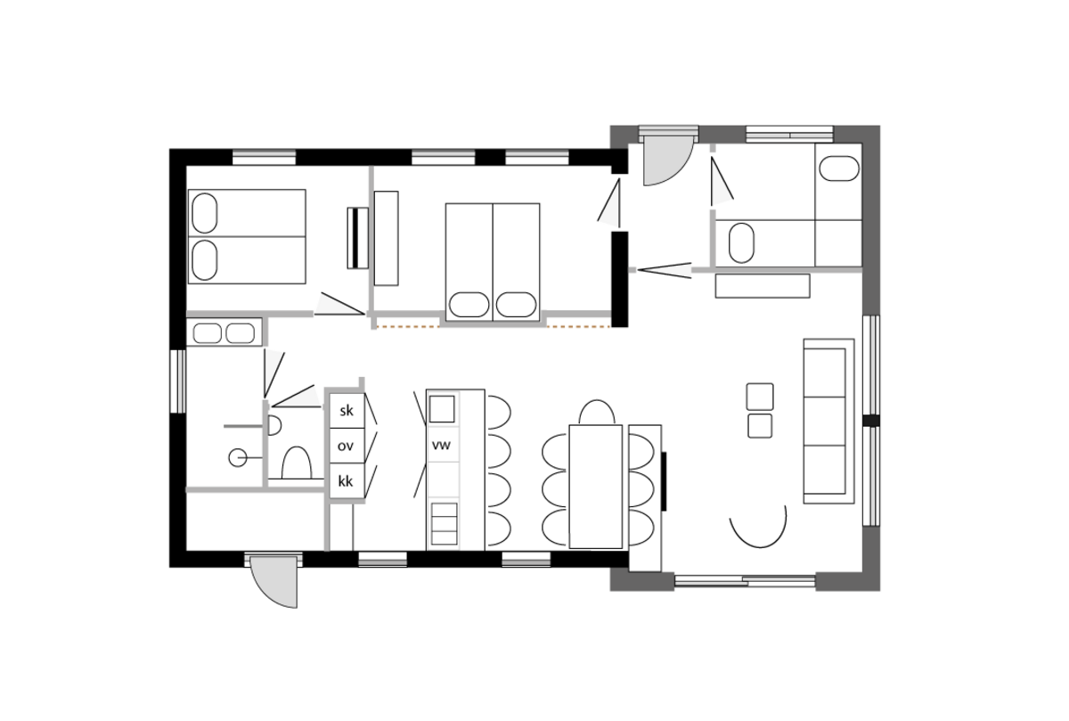 Denne moderne, fritliggende ferievilla er egnet til maksimalt 6 personer. Med en rummelig stue med stort åbent køkken med kogeø har du tilstrækkelig plads og luksus til at nyde din ferie. Hele stuen har gulvvarme, og i opholdsområdet er der et smart-tv. I det luksuriøse åbne køkken kan du lave en lækker kop kaffe eller te, opvaskemaskinen vasker op for dig, og i ovnen kan du lave de lækreste ovnretter. På grund af den praktiske, gennemtænkte indretning har feriehuset et rummeligt præg, men alt er i stueetagen. Der er tre soveværelser, hvoraf 1 soveværelse med to enkeltsenge (kan sættes sammen), et soveværelse med en 2-personers boxmadras og 1 soveværelse er udstyret med en cross-over køjeseng, meget sjovt for børnene! Der er også et rummeligt badeværelse med stor brusekabine og dobbelt håndvask. Toilettet er bevidst placeret separat ved siden af badeværelset.